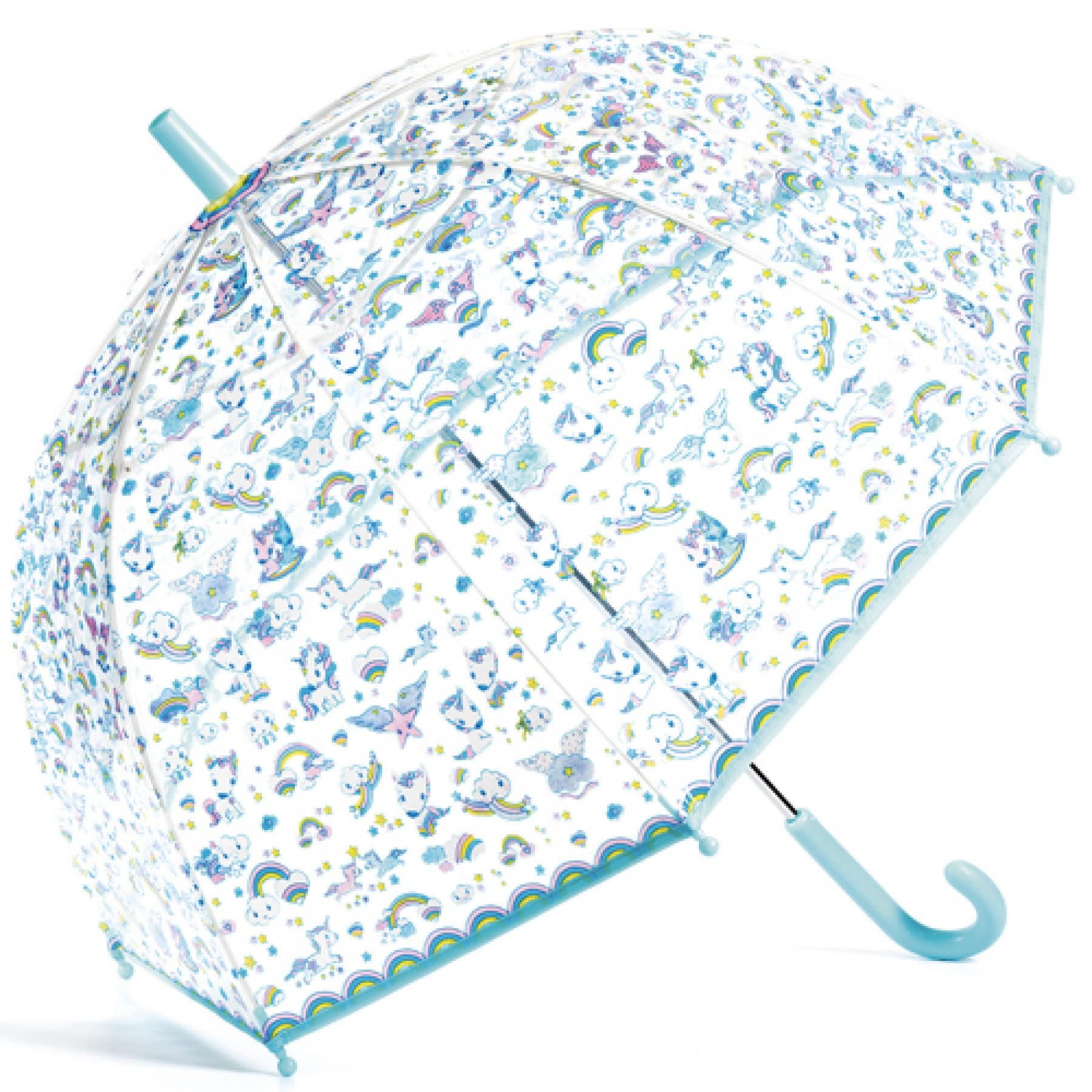 Met de Djeco kinderparaplu – Eenhoorns stap je met plezier de regen in! Deze chique en praktische paraplu heeft een prachtig ontwerp in zachte kleuren met eenhoorns in kawaii-stijl. Dankzij het doorzichtige scherm kan je kind goed zien waar het loopt, zelfs bij een flinke regenbui.