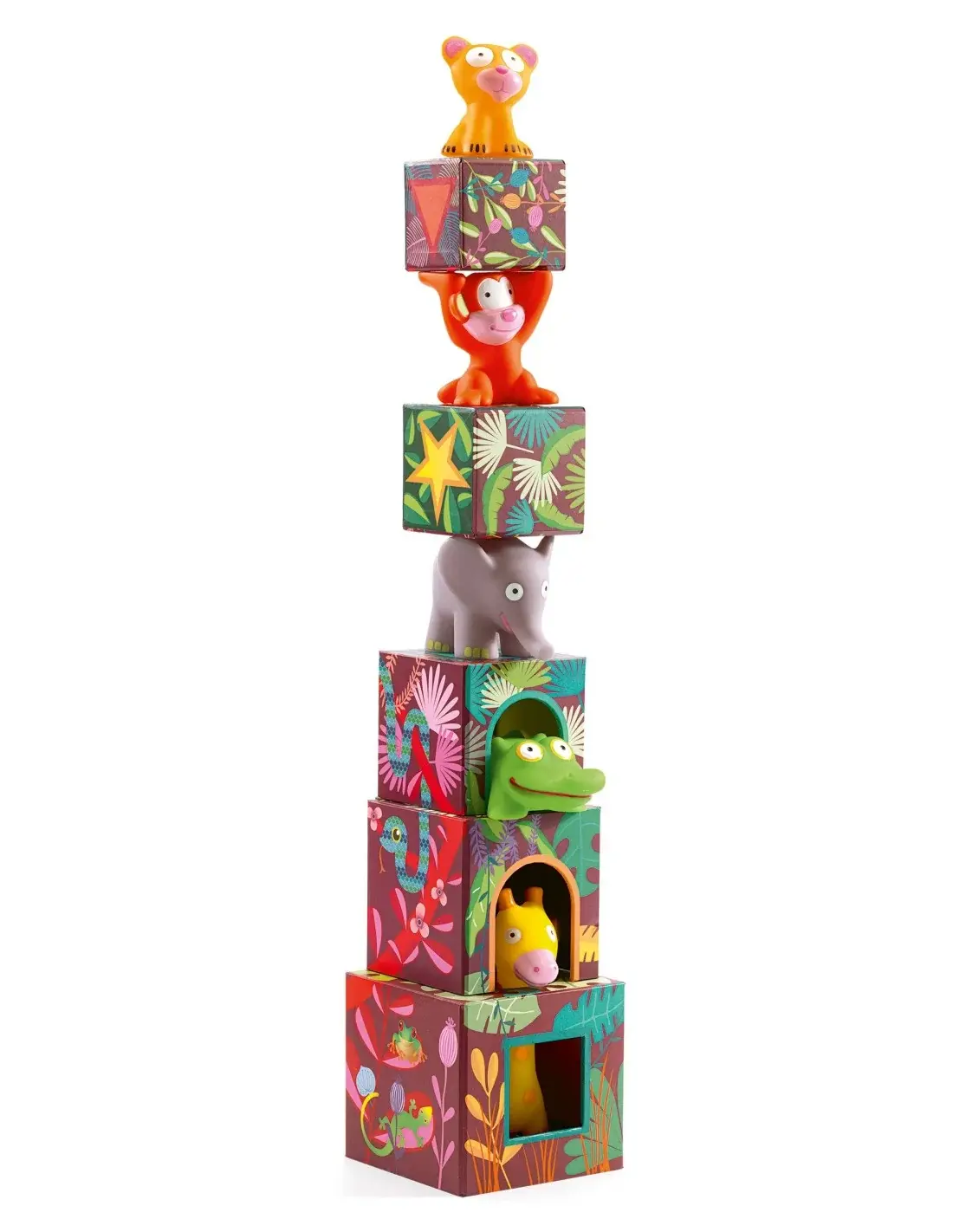 De Djeco stapelblokken – Jungle bieden eindeloos speelplezier voor kleine avonturiers! Deze set bevat 5 prachtig geïllustreerde blokken en 5 grote jungledieren waarmee kinderen kunnen bouwen, stapelen en verhalen verzinnen.