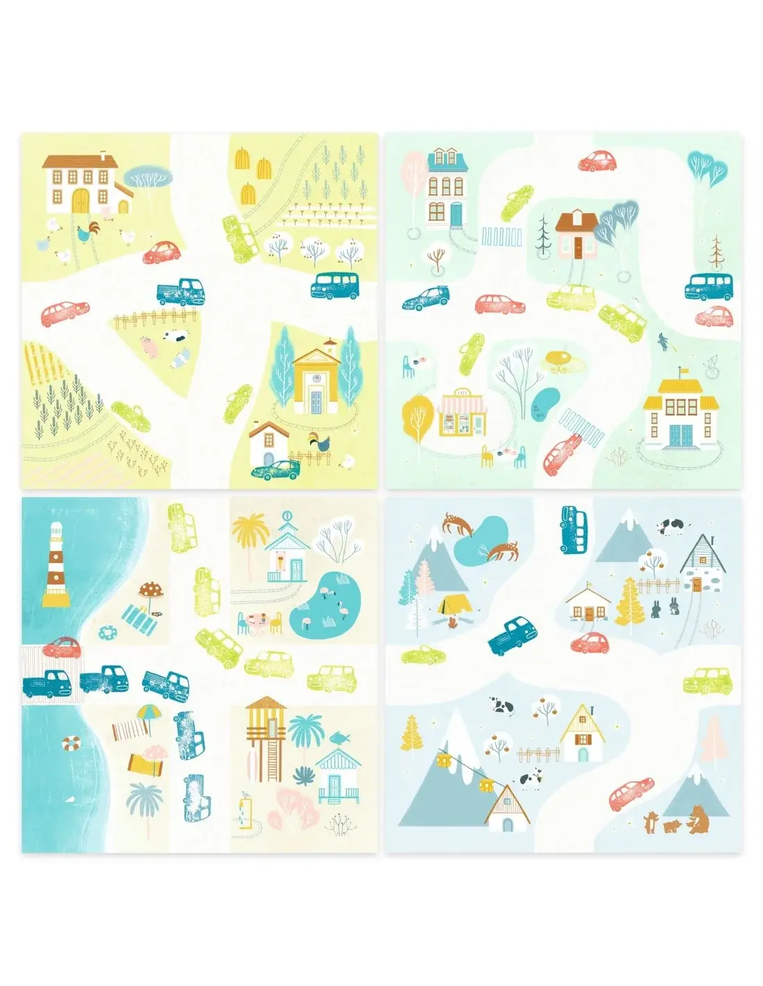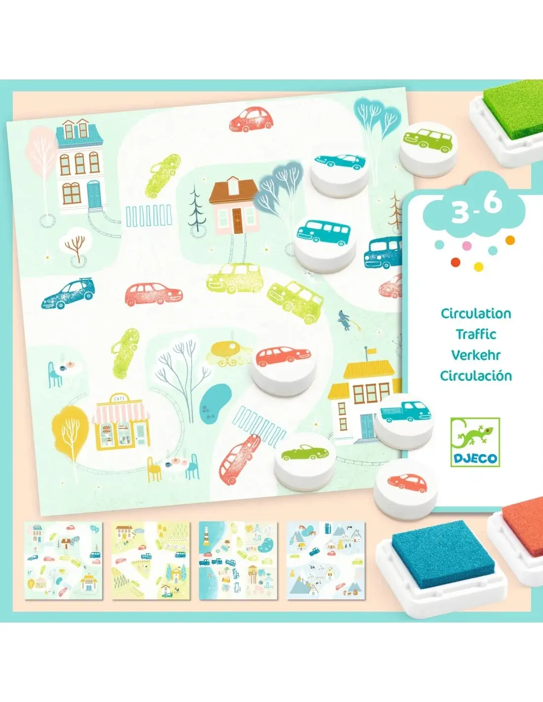 De set bevat drie grote stempelkussens in blauw, groen en oranje. Door de stempels te combineren, ontstaan levendige scènes vol voertuigen en wegen. De kaarten sluiten op elkaar aan, zodat kinderen stap voor stap een grotere wereld kunnen bouwen.