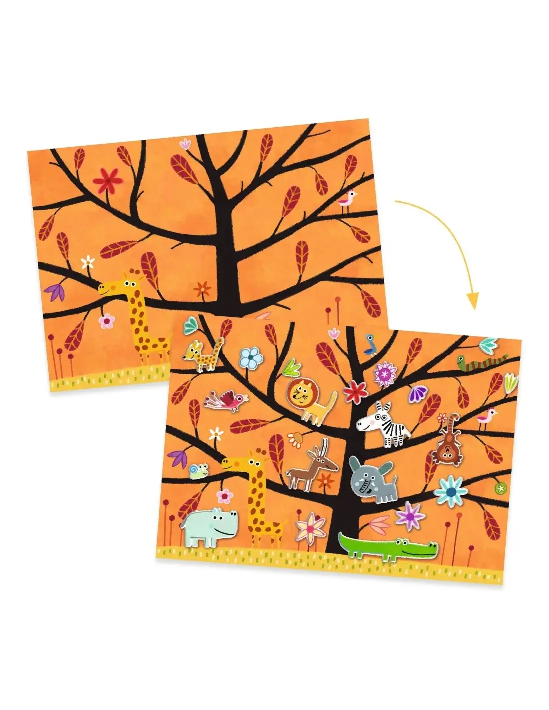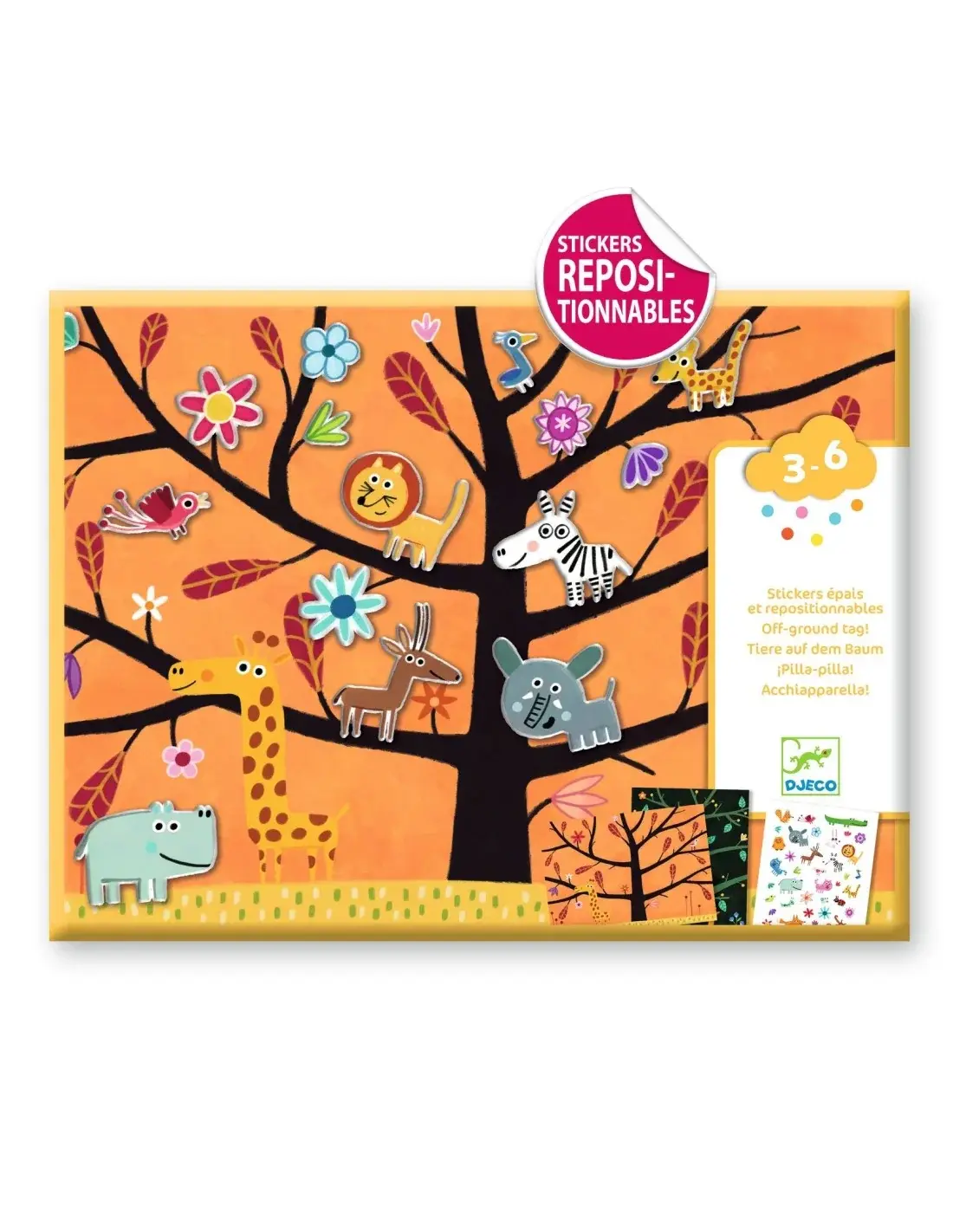 De Djeco stickeractiviteit nodigt kinderen uit om hun eigen avonturen te verzinnen. In dit grote creatieve mapje vinden ze twee geïllustreerde achtergronden – één in de savanne en één in het bos – waarop ze met meer dan 30 dikke, verplaatsbare stickers grappige en originele scènes kunnen maken.