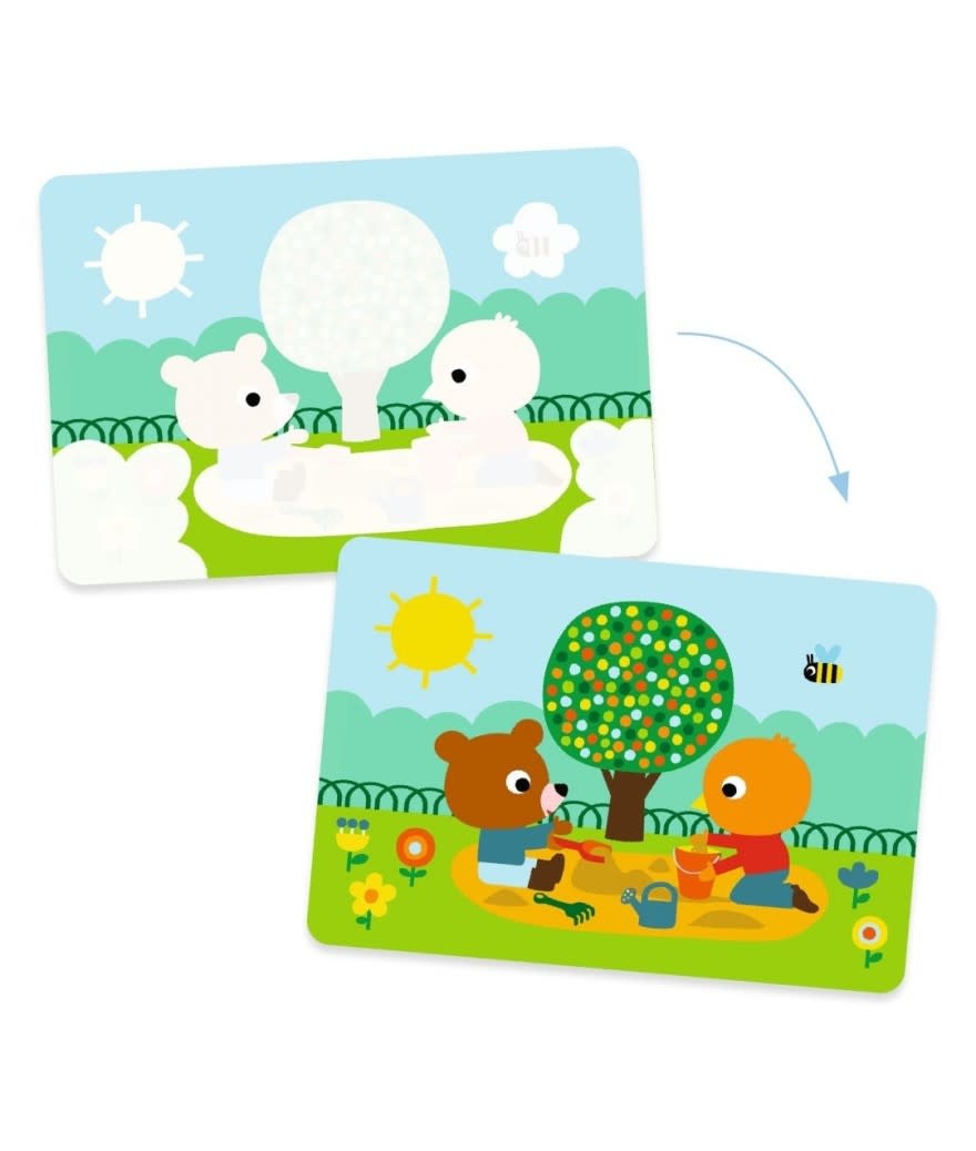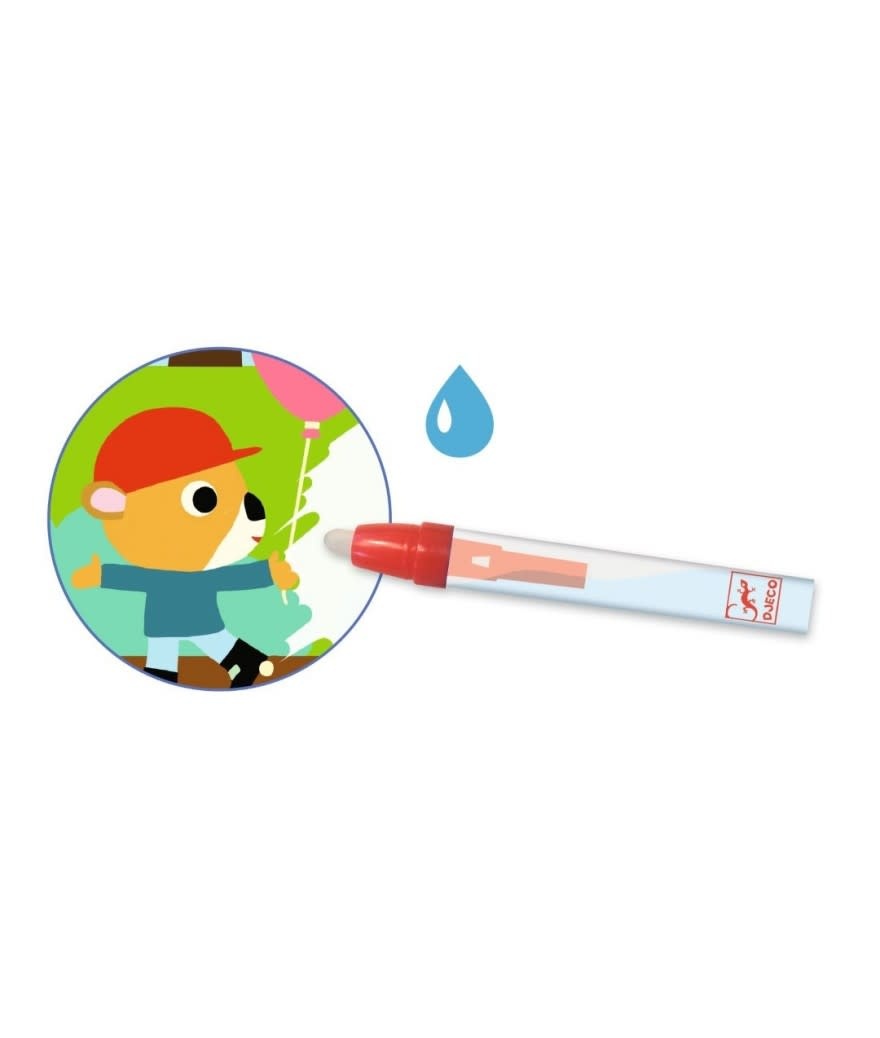 Met het Djeco waterkleurboek – In het Park ontdekken kinderen vanaf 18 maanden spelenderwijs de wereld om hen heen. Met de speciale waterpen kleuren ze de witte vlakken op de platen in en toveren ze stap voor stap de verborgen illustraties tevoorschijn.