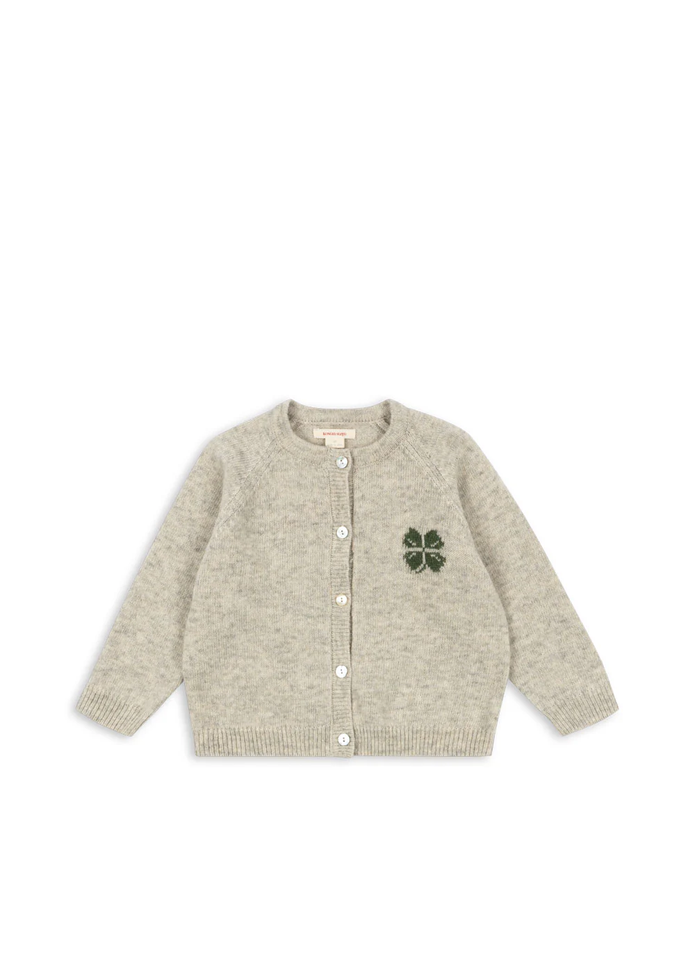 Op de borst is het vest afgewerkt met een klavertje vier, dat ook terugkomt op de rug in combinatie met de tekst Lucky. Het ontwerp heeft een klassieke ronde hals, ribafwerking langs de boorden en sluit aan de voorkant met parelmoer knoopjes. De wolmix zorgt voor warmte en comfort tijdens koelere dagen.