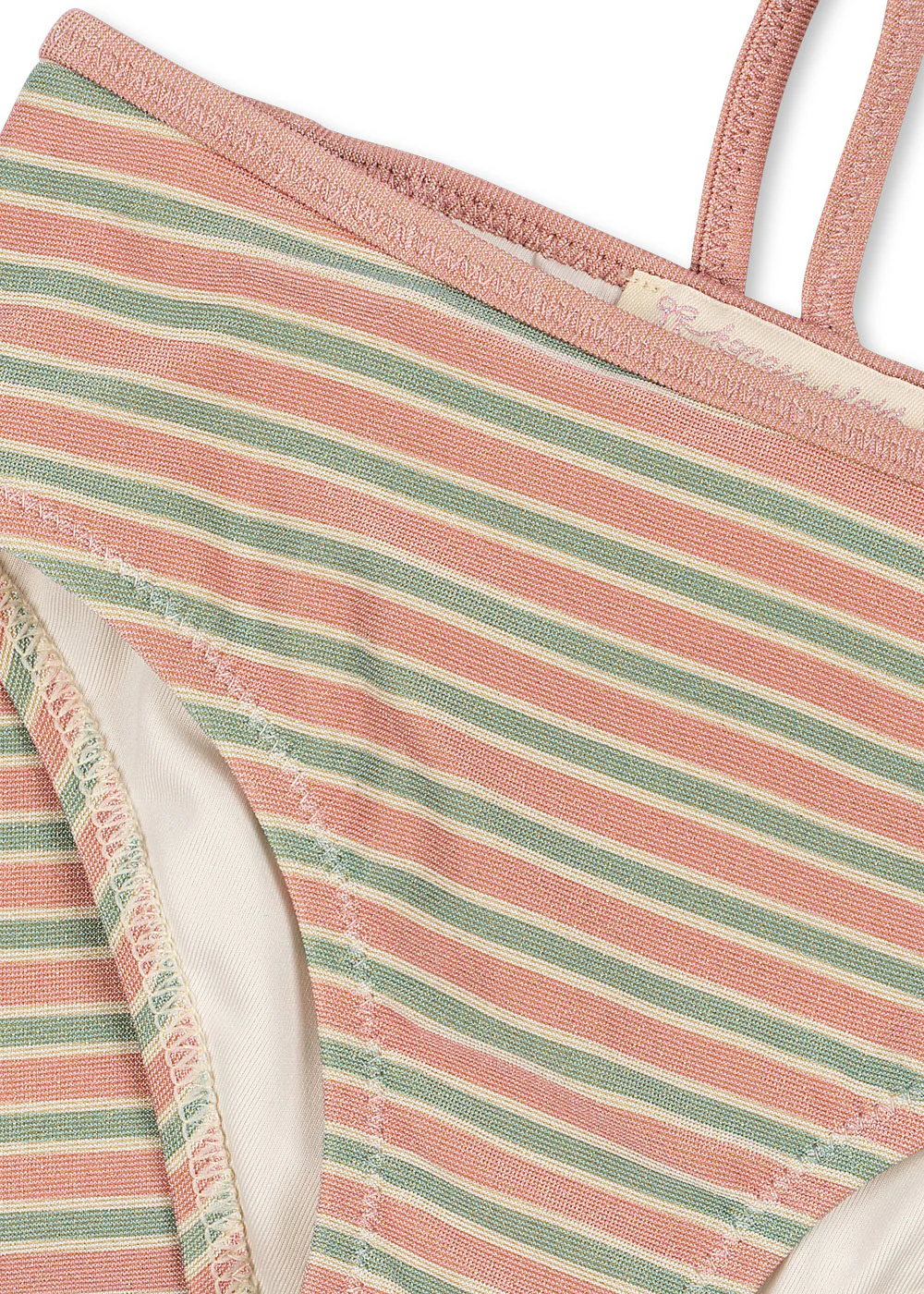 De Bowwow bikini in Blush Stripe van Konges Sløjd is een speelse tweedelige set voor zonnige dagen aan het water. De zachte stof heeft een subtiele shimmer die zorgt voor een lichte glans tijdens het zwemmen.