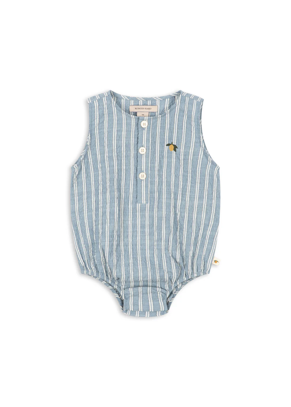 Het subtiele streeppatroon in combinatie met het herkenbare Konges citroentje op de borst geeft deze romper een speelse, zomerse uitstraling. Dankzij de drukknopen bij de beenopeningen is verschonen eenvoudig en praktisch — ideaal voor dagelijks gebruik.