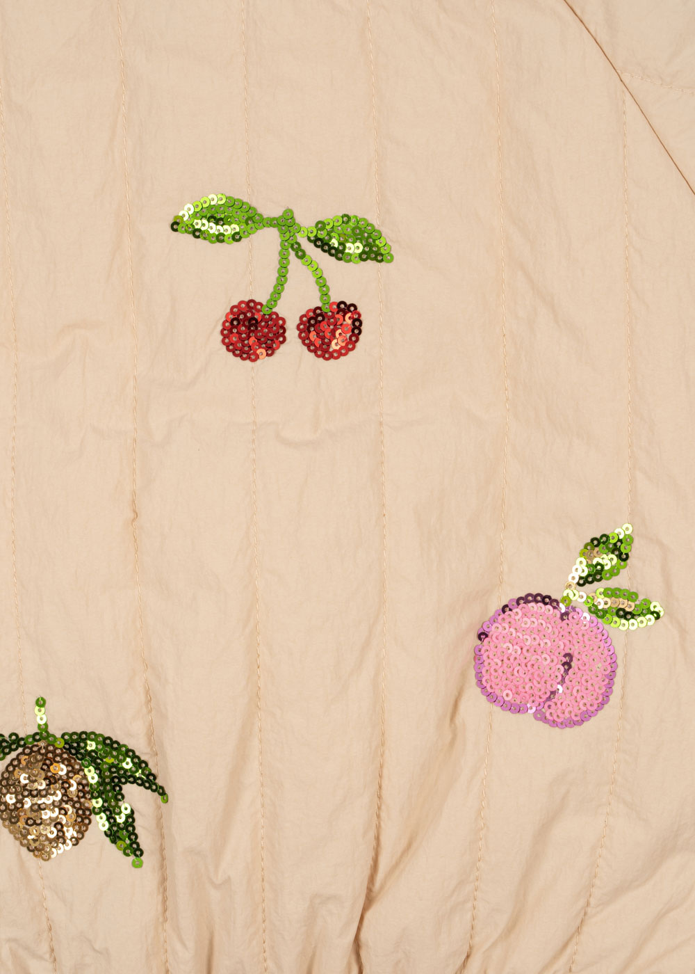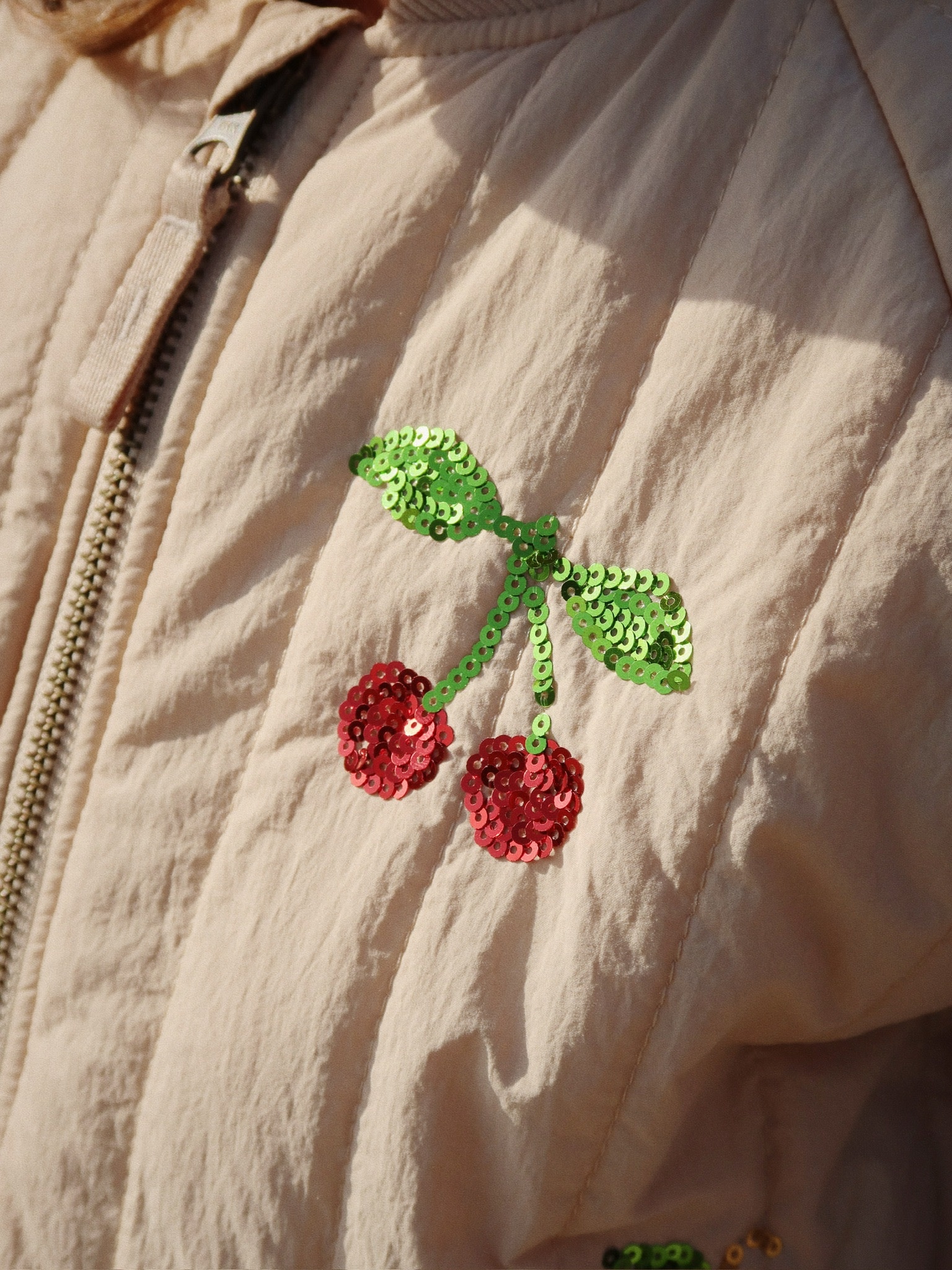 Het jack heeft een subtiel opstaande ribkraagje en een elastische zoom onderaan voor een comfortabele en aansluitende pasvorm. De decoratieve sequin applicaties voegen een speels en stijlvol accent toe, waardoor het jack zowel praktisch als modieus is.