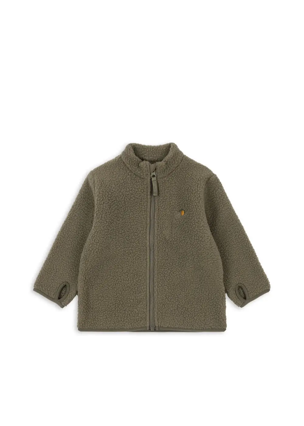 Het Thermy Fleece Jacket in Kalamat van Konges Sløjd is een klassieke fleecejas die perfect is als comfortabele tussenlaag tijdens de seizoenswisselingen. Het jack is ontworpen met een hoge kraag, een stevige ritssluiting en handige duimgaten, waardoor het extra bescherming biedt tegen frisse wind.