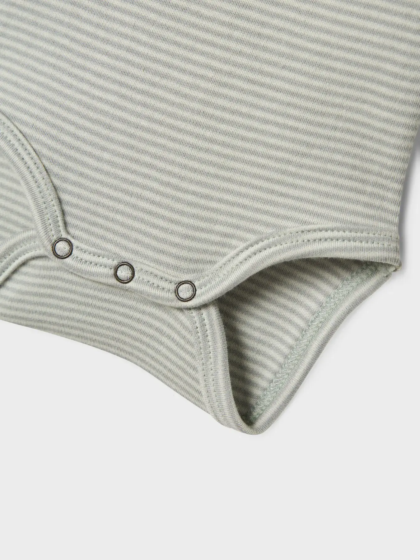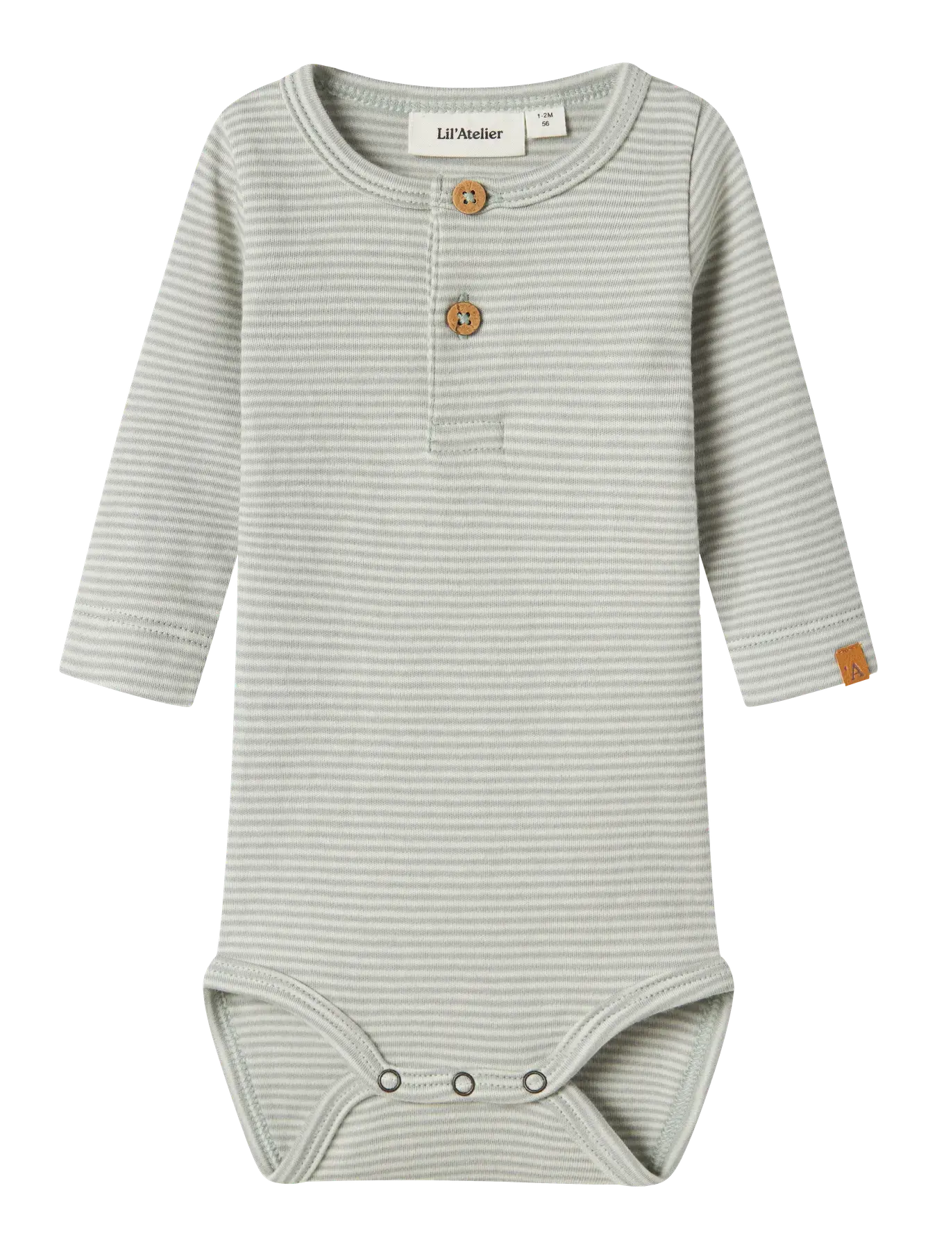 De body heeft lange mouwen, een slim fit pasvorm en een grandad-halslijn met houten knoopjes. Dankzij de handige drukknoopsluiting onderaan is verschonen extra makkelijk.