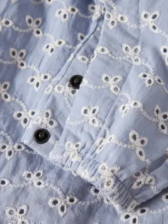 De broderie anglaise details geven de outfit een verfijnde, speelse uitstraling met ronde en ovale uitsneden die typisch zijn voor deze tijdloze techniek. De loose fit maakt de overall extra comfortabel, terwijl de afneembare bandjes zorgen voor flexibiliteit en gemak: ideaal tijdens het aan- en uitkleden.