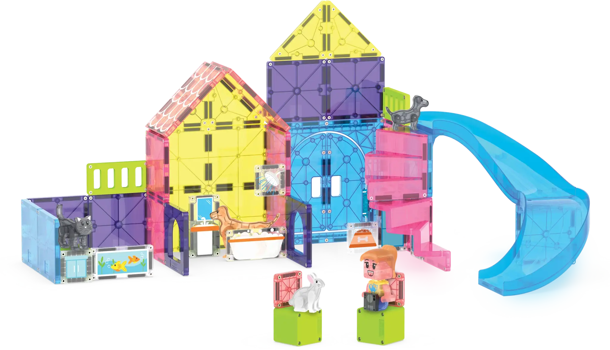 Welkom in het MAGNA-TILES Pet Playhouse, waar huisdieren de hoofdrol spelen en jouw fantasie de vrije loop krijgt! Met deze 50-delige magnetische bouwset creëer je een gezellig speelhuis voor een vrolijke puppy, een nieuwsgierige kat, een schattig konijn en een avontuurlijke hond. Open de dubbele deuren, laat ze van de glijbaan roetsjen en bouw een wereld vol grappige hoekjes en spannende ontdekkingen.