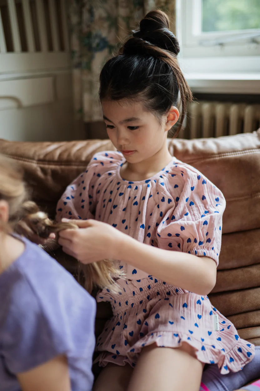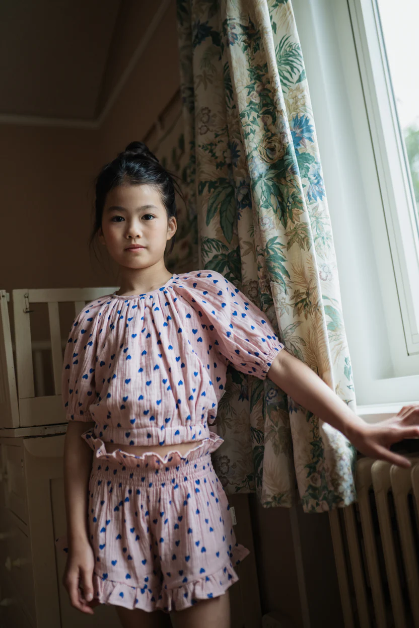 De Adele Blouse – Candy Hearts van Petit Blush is een echte eyecatcher voor de zomer. De blouse heeft een blauwe all-over hartjesprint op een zachte roze basis, wat zorgt voor een frisse en vrolijke uitstraling.