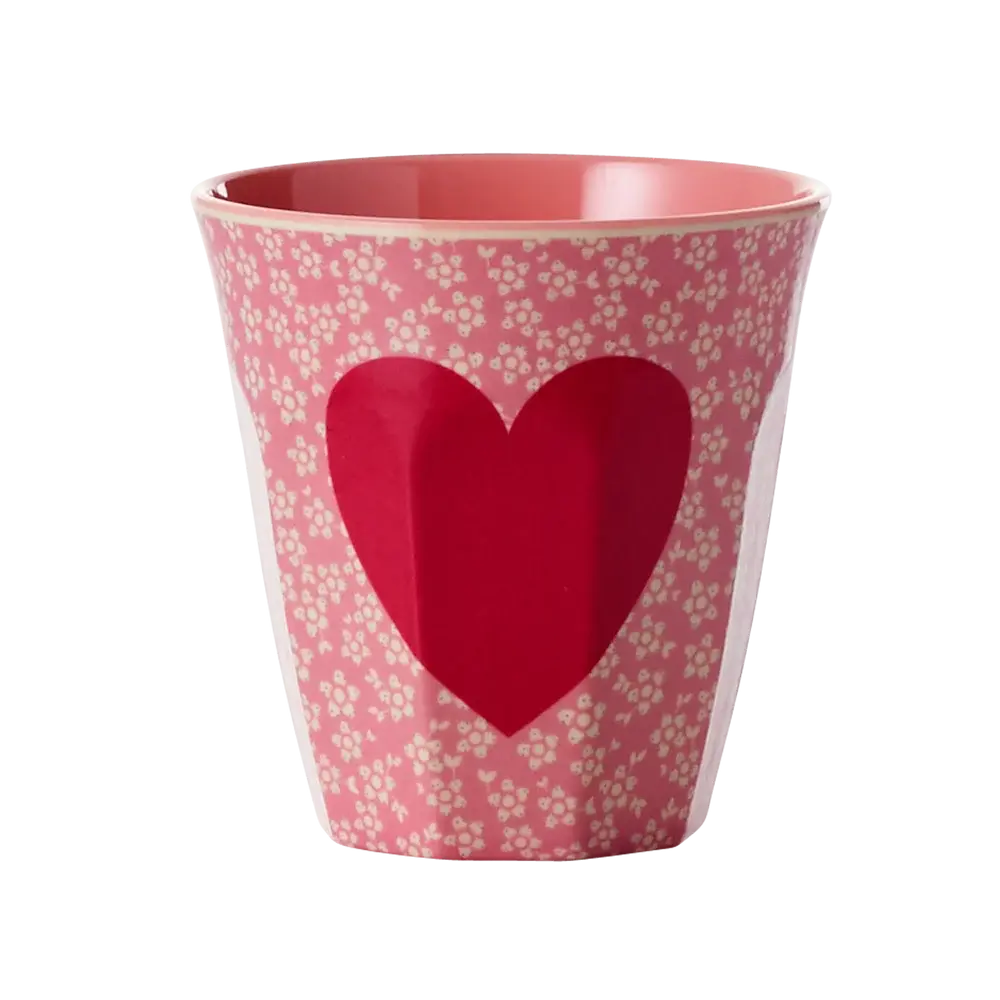 De beker heeft een groot roze hart op een bloemenroze achtergrond en een koraalkleurige binnenkant, wat zorgt voor een vrolijke en warme uitstraling.