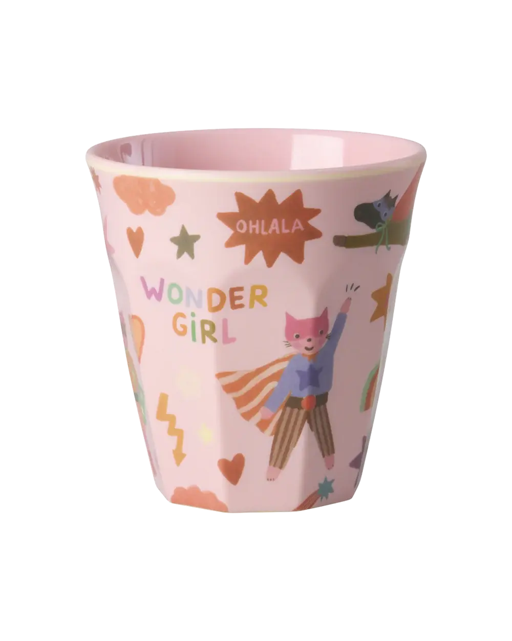 De melamine beker – Hero print (roze) van Rice is een vrolijke en praktische beker voor dagelijks gebruik. De beker is versierd met superhelden, sterren en hartjes en brengt kleur en fantasie aan tafel — ideaal voor ontbijt, lunch of drinken tussendoor.