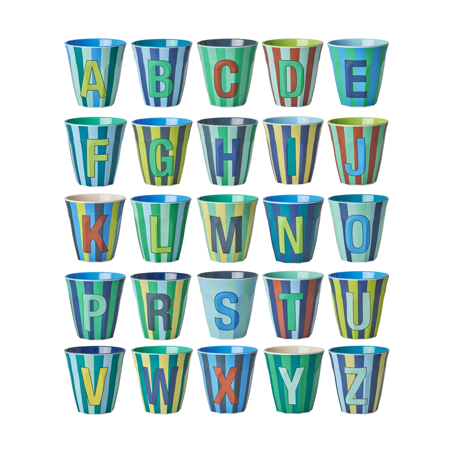 De melamine letterbekers van RICE zijn echte klassiekers: vrolijk, praktisch en altijd een succes bij kinderen én volwassenen. Deze variant met blauwe strepen is perfect om ieder gezinslid of kind een eigen beker te geven.