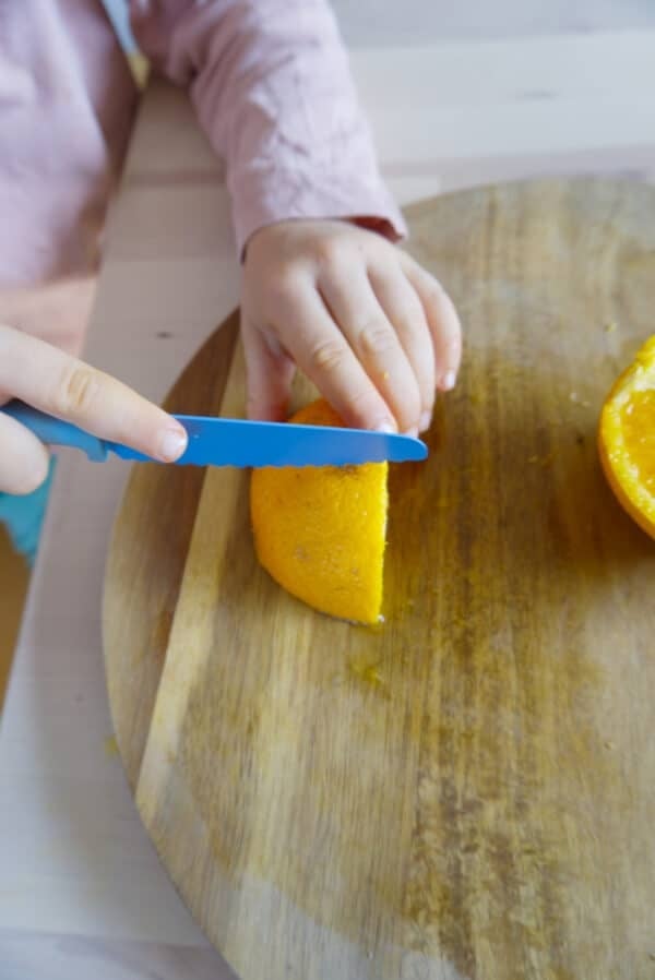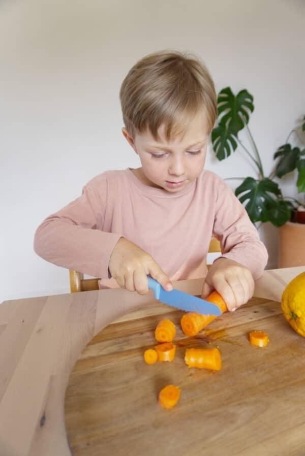 Het mes is veilig en ergonomisch ontworpen, waardoor kleine handjes het makkelijk kunnen vasthouden. Kinderen kunnen hiermee fruit en zachte groenten snijden en zo een echte kookervaring opdoen, zonder de risico’s van een scherp keukenmes.