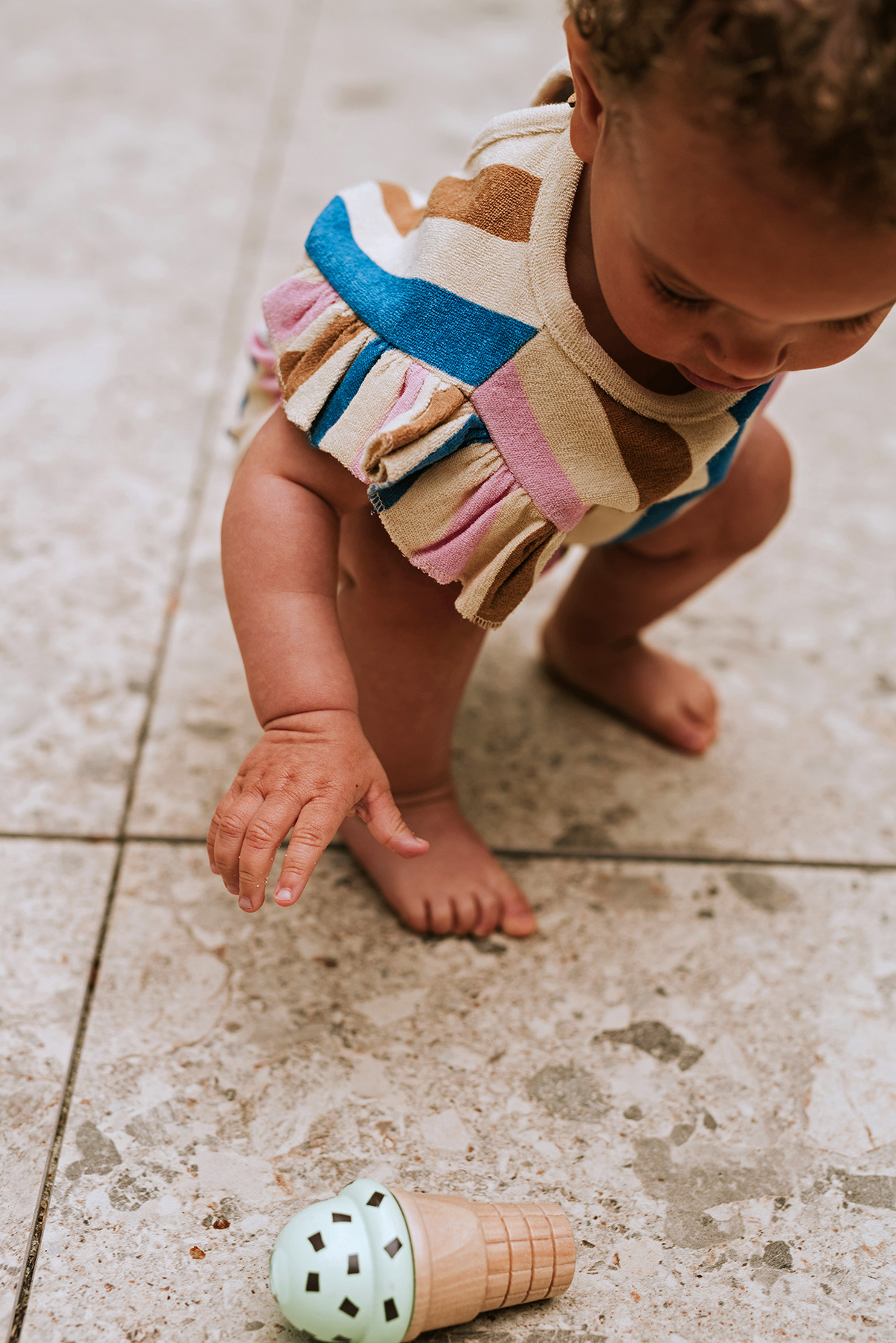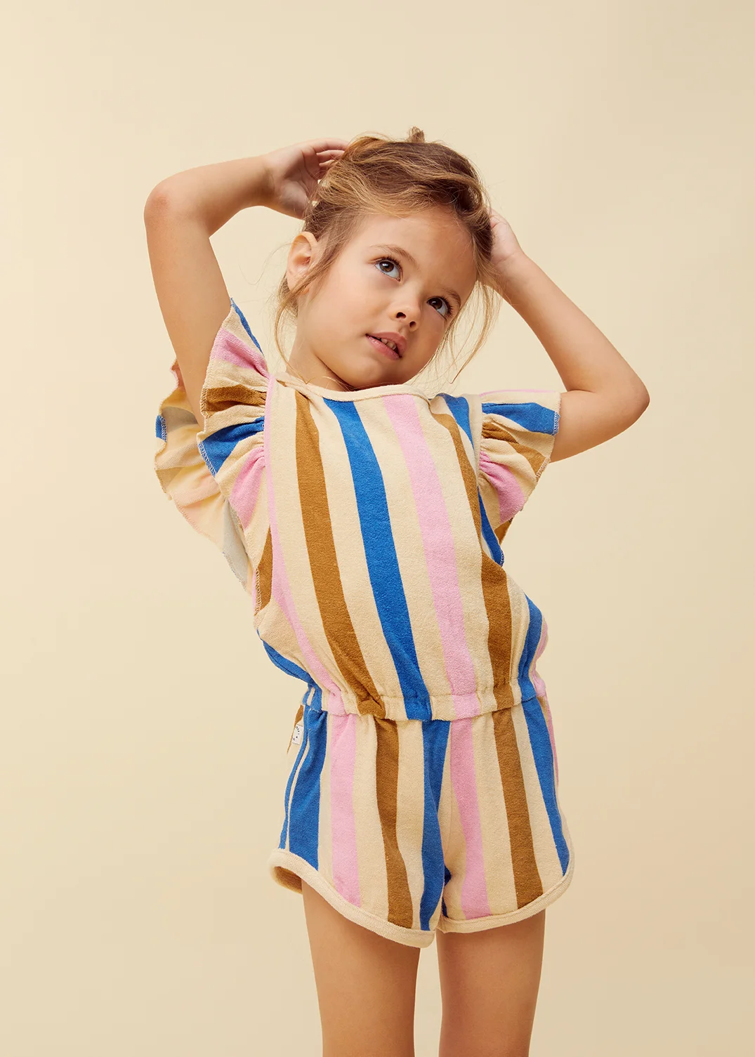 Stripe it up! De Ruffle Jumpsuit Stripes Print - Sesame van Sproet & Sprout is een echte energieke zomeroutfit. De frisse multi colour strepen geven deze jumpsuit een vrolijke en sportieve uitstraling, terwijl de ruffle details zorgen voor een speelse twist.