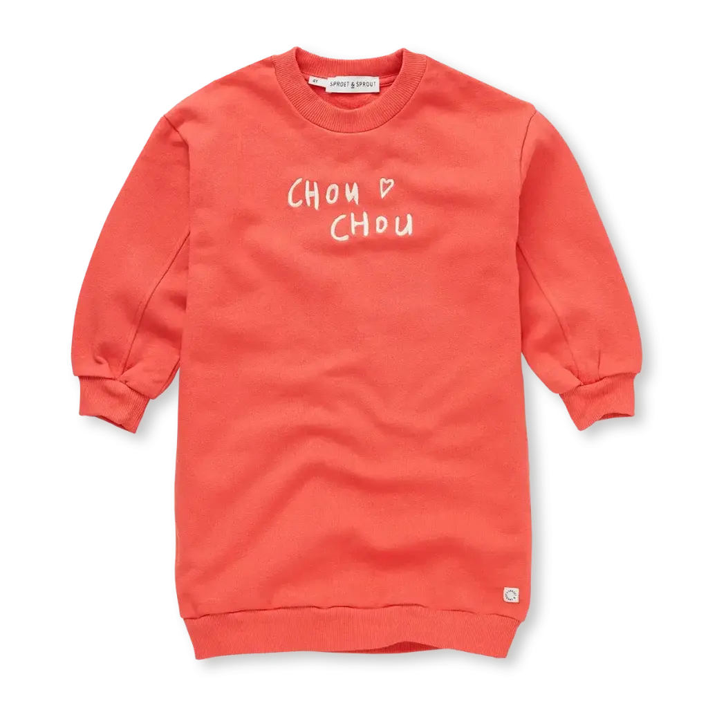 De Dress Chou Chou van Sproet & Sprout is een vrolijke sweaterjurk in de warme kleur grenadine. Op de borst staat een handgetekende ‘Chou Chou’-print die zorgt voor een speelse, Franse knipoog. Dankzij de losse mouwen en de zachte, gebrushte binnenkant voelt de jurk heerlijk comfortabel aan. Ideaal voor frisse winterdagen en makkelijk te combineren met leggings of maillots voor een complete look.